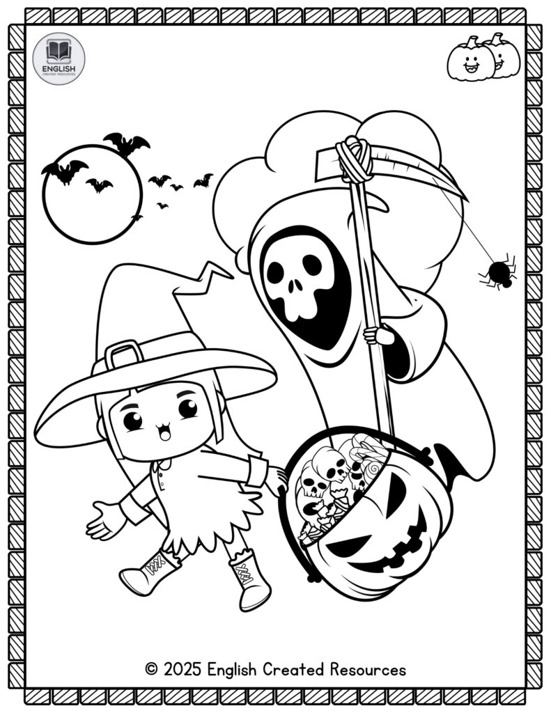 Coloring activities can also be integrated into lessons about colors, shapes, and patterns. Teachers can use Halloween-themed coloring sheets to teach color recognition, asking questions such as, “What color is your pumpkin?” or “Can you find something orange in the picture?” This reinforces vocabulary and early cognitive concepts. Additionally, coloring can be connected to counting and sorting exercises, such as counting the number of candy pieces on a page or identifying shapes like circles, triangles, and stars within the designs. Through these fun, themed activities, children develop early math and literacy skills while staying engaged and entertained.