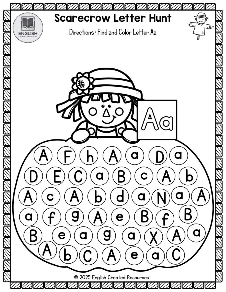In conclusion, Scarecrow Letter Hunt activities offer a perfect balance between fun and education for preschool children. They promote essential early literacy skills, strengthen fine motor control, develop concentration, and nurture a love of learning. The combination of visual discovery, thematic creativity, and hands-on engagement makes these activities a vital resource in early childhood education. As children search for letters among the playful scarecrow design, they are not just completing a worksheet—they are laying the foundation for reading, writing, and lifelong curiosity.
