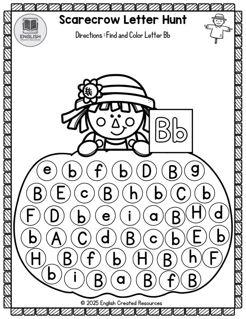 One of the greatest benefits of Scarecrow Letter Hunt activities is that they build letter recognition, which is a cornerstone of early reading. Before children can learn to read words or sentences, they must first be able to recognize and name individual letters. Through searching and identifying both uppercase and lowercase letters on a worksheet, children learn to distinguish the shapes and sounds that make up the alphabet. Repeatedly spotting and coloring a target letter, such as “B” in the activity, strengthens a child’s memory and helps them internalize the form and pattern of that letter. This recognition becomes automatic with practice and lays the groundwork for future reading success.
