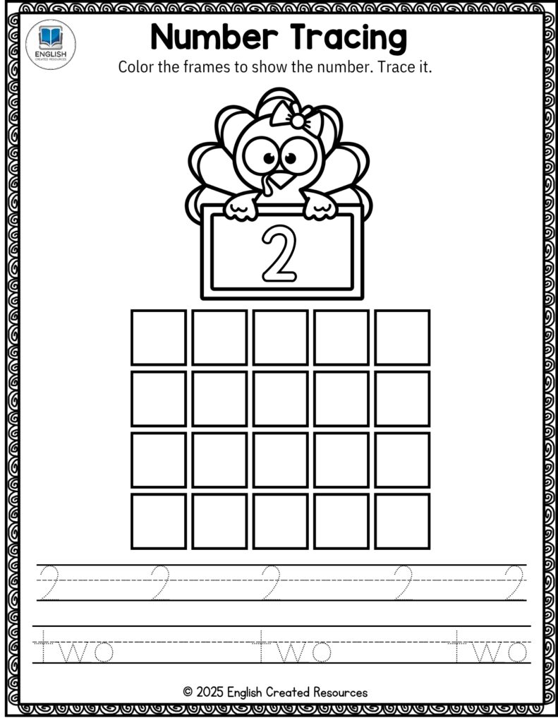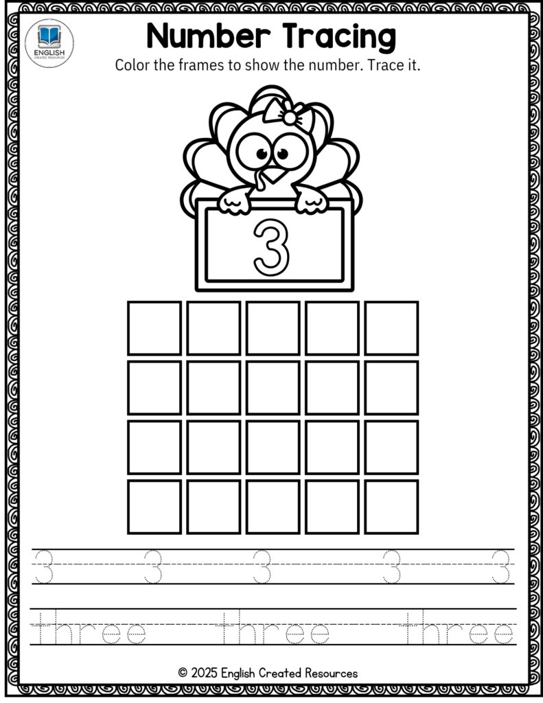 To complete this Number Tracing activity, first look at the turkey holding the card to see which number you are working on. Next, move to the group of small boxes below and color the same number of boxes to show the quantity, starting from the top left box and moving in order. After coloring the boxes, trace the number on the dotted lines carefully to practice number formation. Then, trace the number word on the dotted lines to learn how to write it correctly. When you finish tracing, you can color the turkey to make your work bright and fun. This activity helps you recognize the number, understand its value, and practice both writing the numeral and its word.